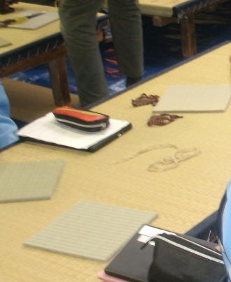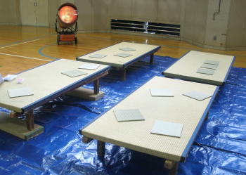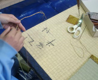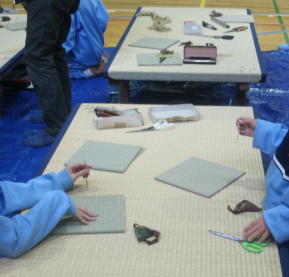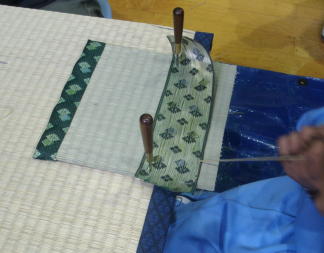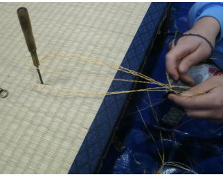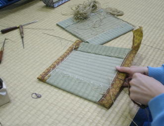 畳の台を並べて作業台にしてミニござを作成しました