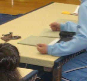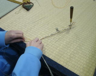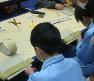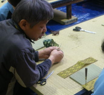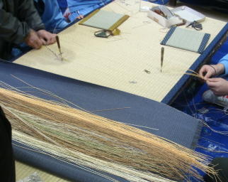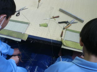 畳の台を並べて作業台にしてミニござを作成しました